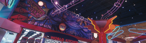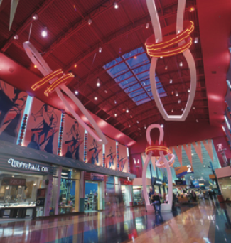 This value oriented retail center celebrates regional themes. Environmental graphics, architecture, sculpture, lighting, sound, and floor patterns transform the shopping center into five distinct neighborhoods and four co-branded environments.