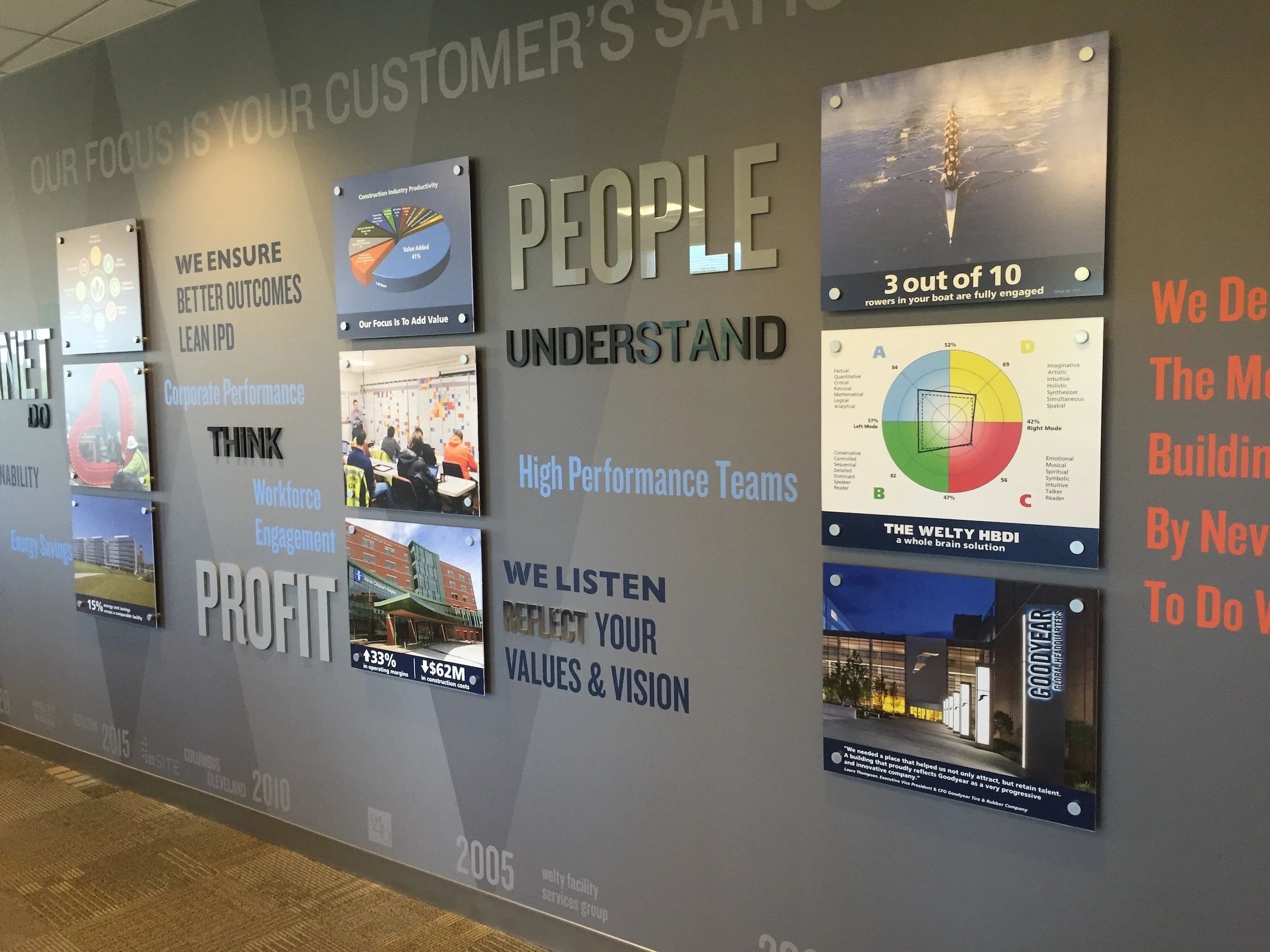 the Welty process to potential clients. Additional branded graphics created special areas while remaining true to the corporate vision. All elements were introduced after construction and each became seamless in their integration at multiple office locations.